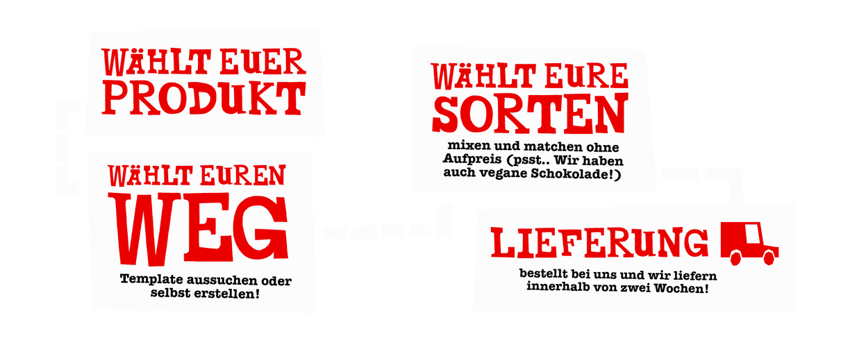 Egal ob ihr eine LKW-Ladung voller personalisieter Schokolade oder nur ein paar Werbegeschenke mit eurem Logo benötigt, wir haben die Lösung für all eure Wünsche
